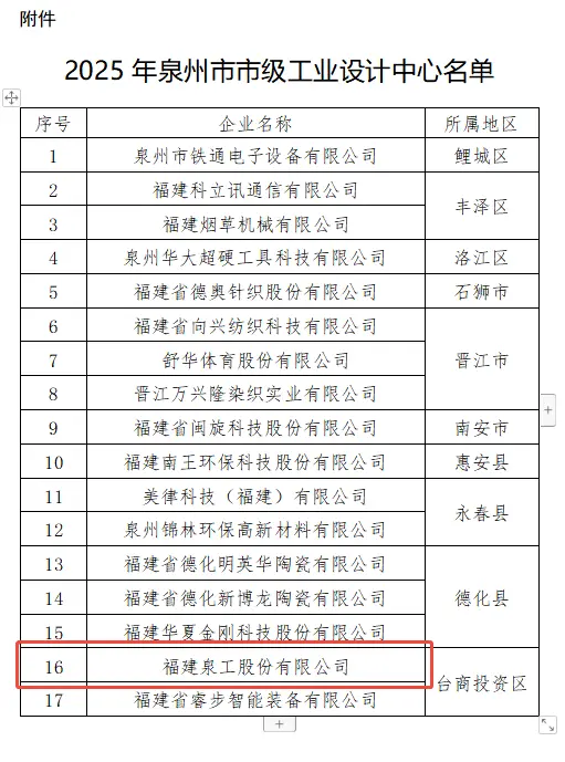 De acuerdo con las Medidas de Gestión para el Reconocimiento de los Centros Municipales de Diseño Industrial de Quanzhou, las empresas evaluadas deben cumplir plenamente los estándares en términos de proporción de inversión en diseño industrial, número de patentes, tamaño del equipo de diseño y profundidad de la cooperación en investigación entre universidades e industrias, y tener importantes efectos de demostración e impulso de la industria. En los últimos años, Quangong Group ha aumentado continuamente su innovación en diseño industrial, ganando múltiples premios importantes de diseño industrial nacionales e internacionales y liderando o participando en la formulación de 11 estándares nacionales e industriales.