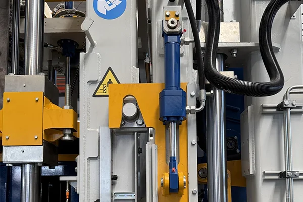 7Dispositivo de bloqueo del cabezal de prensa Este mecanismo de bloqueo mecánico consta de bloques de bloqueo de alta resistencia, un cabezal de prensa en forma de cuña y cilindros hidráulicos de doble efecto. Durante el desmolde, los cilindros accionan los bloques de bloqueo para sujetar radialmente el cabezal de la prensa, formando un punto muerto mecánico. Luego, el molde se libera bajo presión constante, lo que elimina eficazmente el rebote elástico y los micromovimientos, lo que garantiza bordes afilados de los ladrillos, superficies lisas y una tasa de calificación del producto enormemente mejorada.